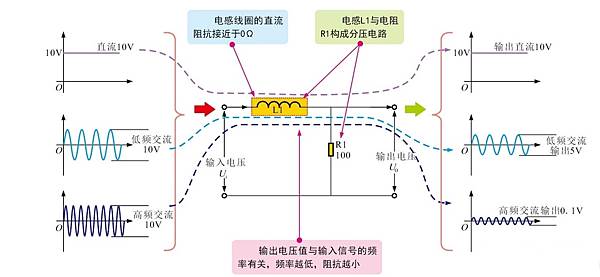 電感對直流呈現很小的電阻(近似於短路),對交流呈現的阻抗較高,其阻值的大小與所通過交流信號的頻率有關。