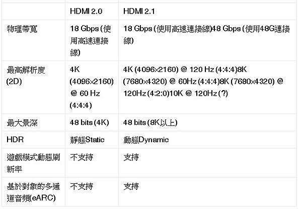 HDMI 2.1與HDMI 2.0/2.0a主要特點對比