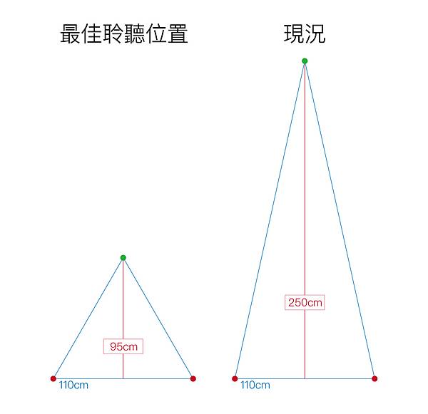 正三角形最佳聆聽位置,大約是床尾的位置95cm。