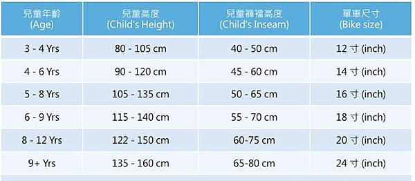 表單中有年齡、身高,以及褲檔高度(腿長),可以依據孩子個別的條件參考選擇。