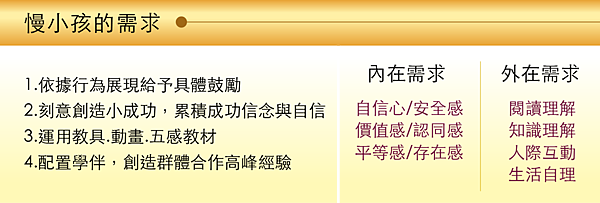 因為慢小孩自己也知道落後班上多數同學,慢小孩也會希望儘早趕上班級的步伐。