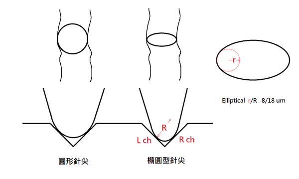橢圓形針藉著側邊比較小的半徑,可以拾取到微小的變化,聽感上泛音會多一些,