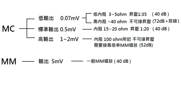 MI、MM唱頭輸出較高,大概為1mv到5mv之間,不需要升壓器或前前級、製造成本低,唱針通常可以自行更換;