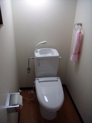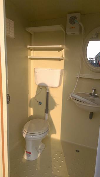 馬桶與洗臉盆合一,上方的水龍頭拉起來就是蓮蓬頭,用完放下去是水龍頭