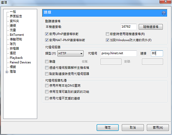 在utorrent的「選項」->連線->代理伺服器下設定HiNet Proxy