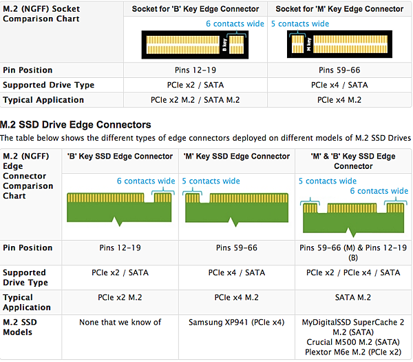 純SATA、純PCIe x2、純PCIe x4(只寫PCIe 通常是PCI-e x2)、PCIe x2+SATA、PCIe x4+SATA