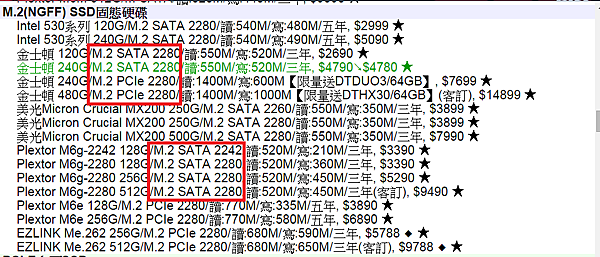 M.2 PCI-e x2 SSD 貴SATA3 SSD 同容量產品 價格20%以上