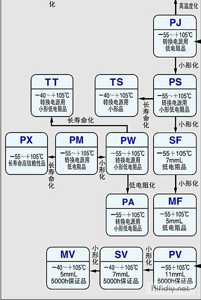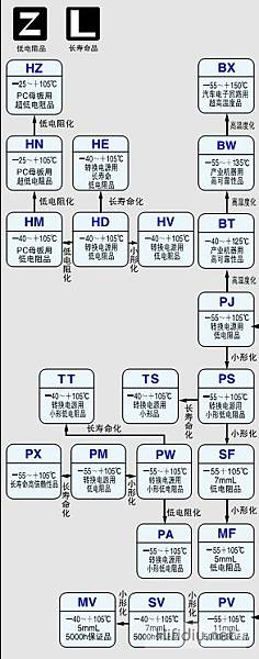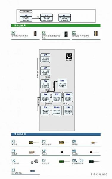 其中的音頻電容分幾個大類,音頻系列、無級系列、105度系列、超矮系列、MUSE系列和 KG系列。
