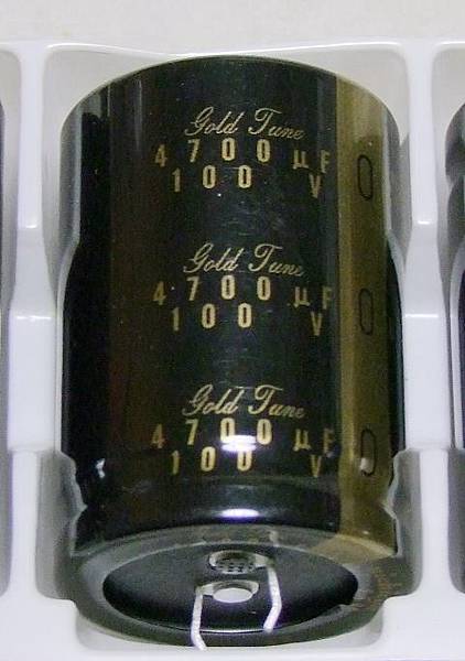 Nichicon KG系列是其生產的音頻專用大容量高壓濾波電容系列。GOLD TUNE是其KG系列中高規格的音頻專用電容,僅次於金腳系列,金字黑皮。適合做電源主濾波電容用。他的聲音通透清澈,聲底乾淨俐落,層次好,低頻緊 湊,高頻有穿透力,唯中頻稍淡一點。整體上偏向HIFI性,清爽有勁很現代的感覺。採用高純度無氧銅大電流插針引腳。