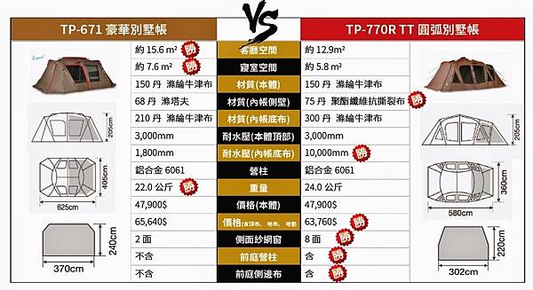 風雨時,TP-770R可將前庭側邊布拉開,但TP-671因為沒有側邊布所以風雨會打進客廳,因此客廳使用空間也會降低。