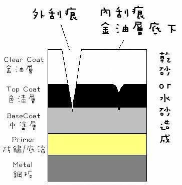 而我們汽車美容的目的就是要將這些刮痕做修復,將金油層面的瑕疵清除,保護好最重要的金油層~